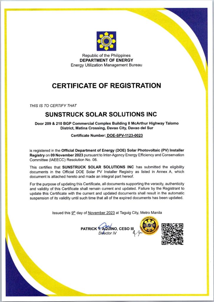 At Sunstruck Solar Solutions, we proudly serve communities across Visayas and Mindanao in The Philippines, delivering high-quality solar energy systems that are built for the Philippine climate. With our base in Davao City, we are strategically positioned to provide DOE-accredited solar installations, maintenance, and consultation services to homes, businesses, and institutions throughout the southern regions of the country.